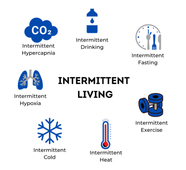 Het Intermittent Living concept is gedurende 8 jaar ontwikkeld met behulp van twee wetenschappelijke basisonderzoeken; 'The study of origin' en 'Intermittent Living'. De resultaten van deze studies zijn gepubliceerd in gerenommeerde wetenschappelijke tijdschriften en de grondlegger van dit concept, Dr. Leo Pruimboom, is erop gepromoveerd aan de Universiteit van Groningen. Het concept is gebaseerd op de wetenschap achter de werking van hormetische prikkels zoals kortdurende extreme koude & hitte, hypercapnia (CO2-therapie), hypoxie (lage O2-therapie), sauna, intermittent fasting, intermittent drinking en meer. Het blijkt dat ons lichaam zich genetisch nog helemaal niet heeft aangepast aan onze huidige manier van leven. In onze ontwikkeling hebben we 200.000 jaar te maken gehad met acute stressoren, zoals koude, warmte, honger, dorst, hypoxia en hypercapnia. Wetenschappelijk is inmiddels aangetoond dat ons immuunsysteem daar een adequaat antwoord op heeft en niet op de chronische prikkels van deze tijd: ons huidig eetpatroon, zittend bestaan en stress. Deze chronische stressoren zorgen ervoor dat ons immuunsysteem chronisch licht geactiveerd blijft, waardoor er continu een laaggradige ontstekingsreactie aanwezig is, met als gevolg alle ziektebeelden van deze tijd. Onze oude stressoren maken het mogelijk om direct te reageren op veranderende omstandigheden, ze maken ons flexibel. “Het zijn niet de sterkste of slimste individuen die overleven en fit zijn, maar de individuen die zich het best kunnen aanpassen aan omstandigheden en omgeving! Om te overleven moest onze soort zijn vindingrijkheid en uithoudingsvermogen regelmatig tot het uiterste benutten. In onze strijd met een onvoorspelbare natuur evolueerden we van sterke apen tot slimme mensen,” aldus Dr. Leo Pruimboom. Doel: herstel van flexibiliteit en fitheid, waarover je zelf weer de regie krijgt